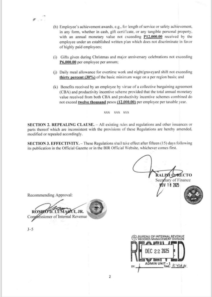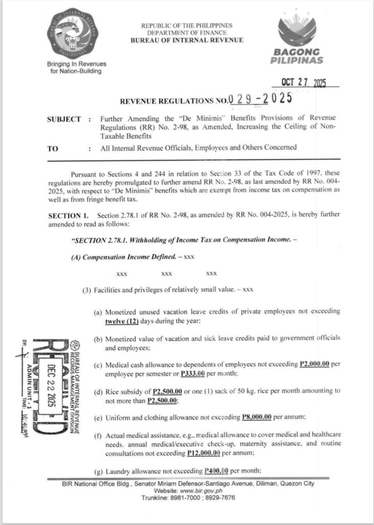 BIR Issues RR 029-2025: De Minimis Benefit Ceilings Officially Raised